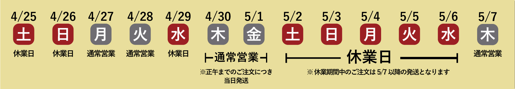 誠に勝手ではございますが、弊社GW休業に伴い、GW期間中の発送について下記の通りお知らせ申し上げます。