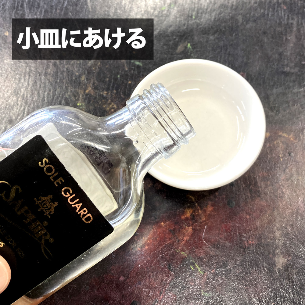 - 本品を小皿などの容器に取り、布やスポンジ、ブラシに取って革底に塗布します。